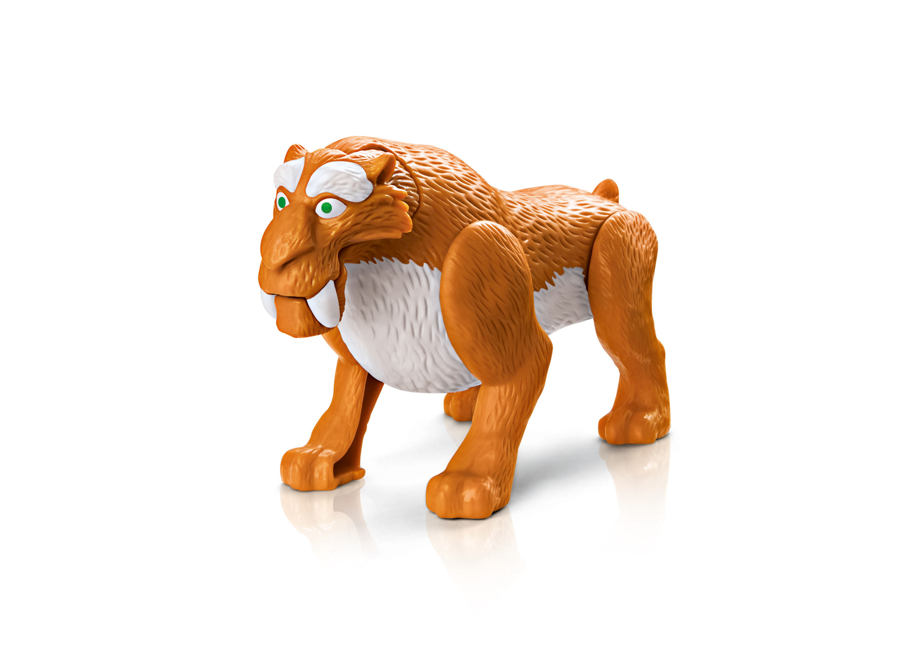 Diego: esse tigre é sorridente! Acione o botão no peito dele e pressione o dente-de-sabre para baixo para ele gargalhar