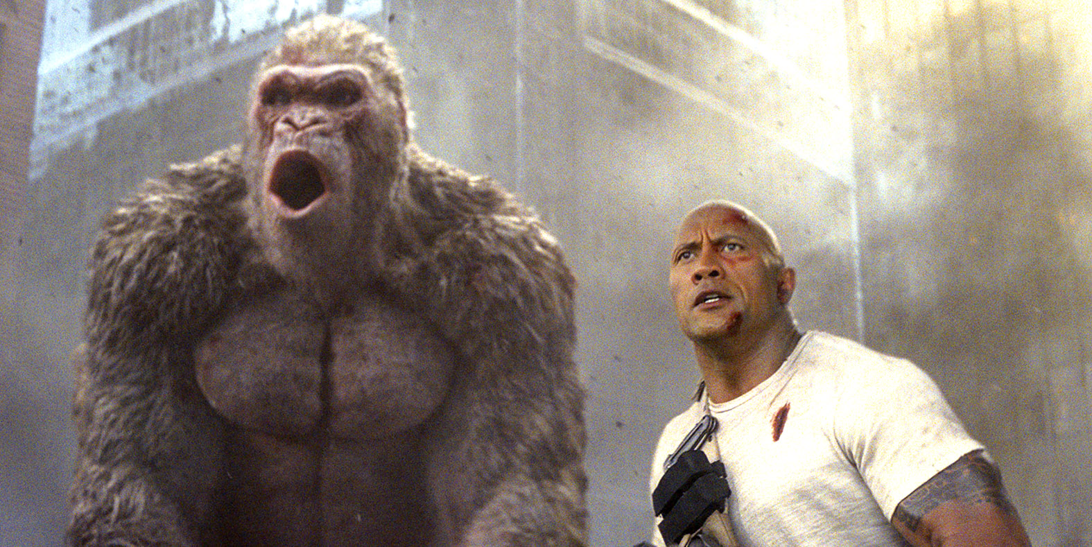 Em Rampage: Destruição Total, The Rock é Davis Okoye, um primatologista que tem grande carinho e cuidado pelo inteligente gorila George. Após um desastre em uma plataforma no espaço, diversas amostras de um experimento de uma empresa genética que contém um patógeno caem na Terra, fazendo com que George sofra uma modificação em seu DNA, ficando extremamente agressivo e crescendo consideravelmente dia após dia. Caberá a Okoye, com a ajuda da engenheira genética Kate Caldwell (Naomie Harris, de Extermínio), tentar salvar seu amigo antes que ele destrua toda a cidade.