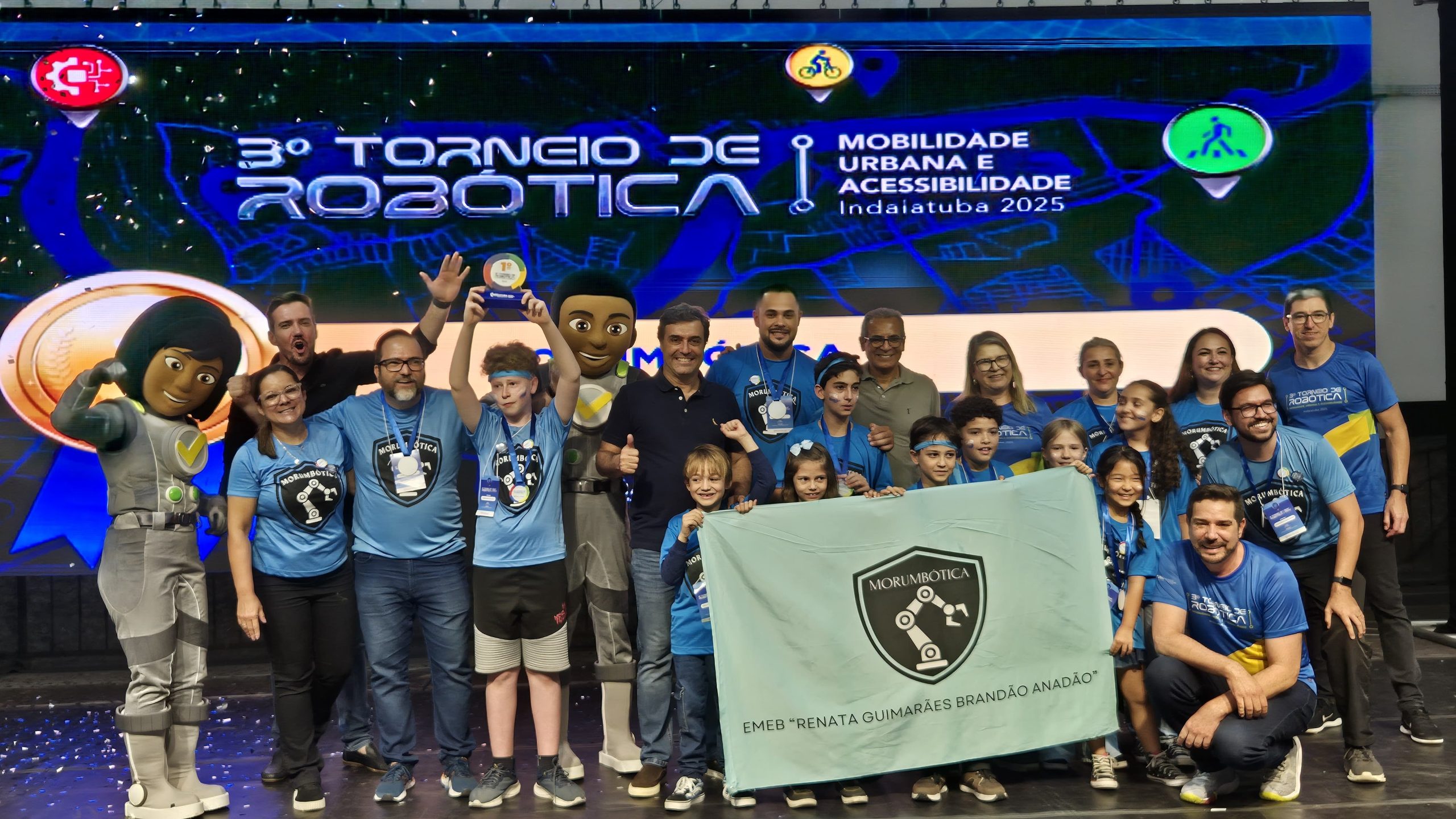 #PraTodosVerem: Foto da equipe vencedora da Emeb Renata Guimarães Brandão Anadão – Jardim Morumbi, alunos, professores, autoridades, em cima do palco do 3º Torneio de Robótica.